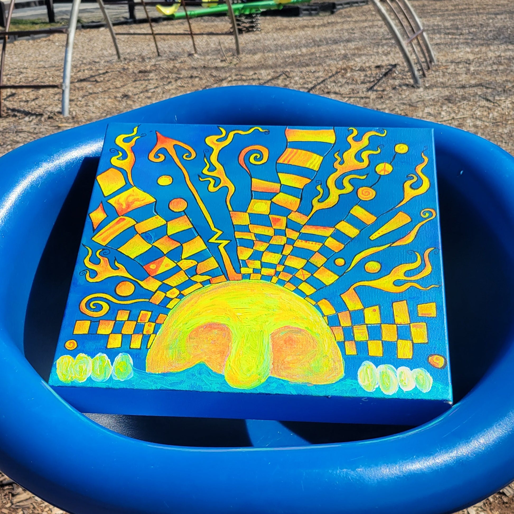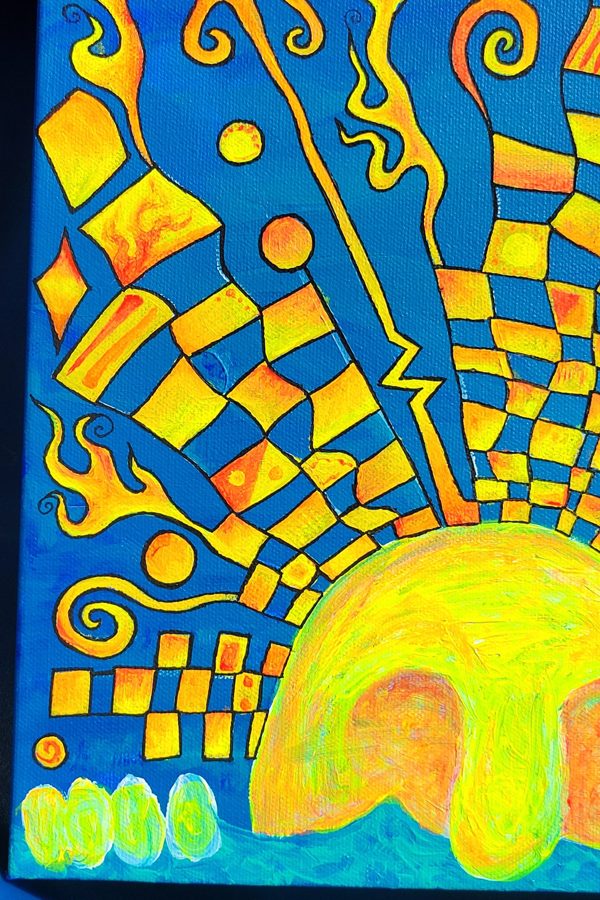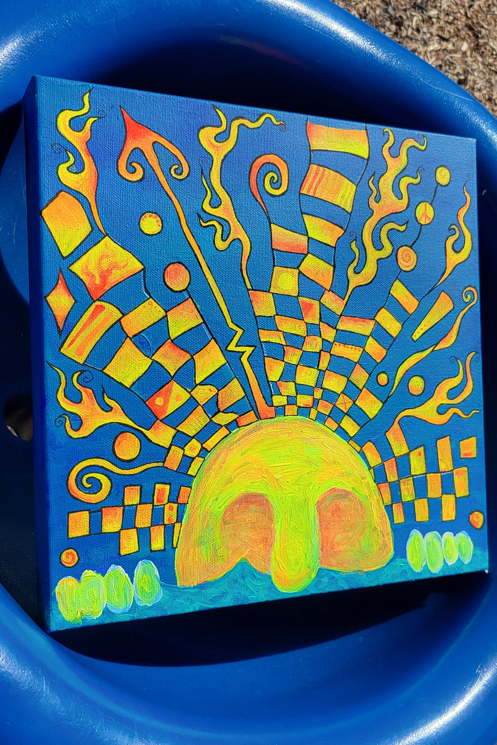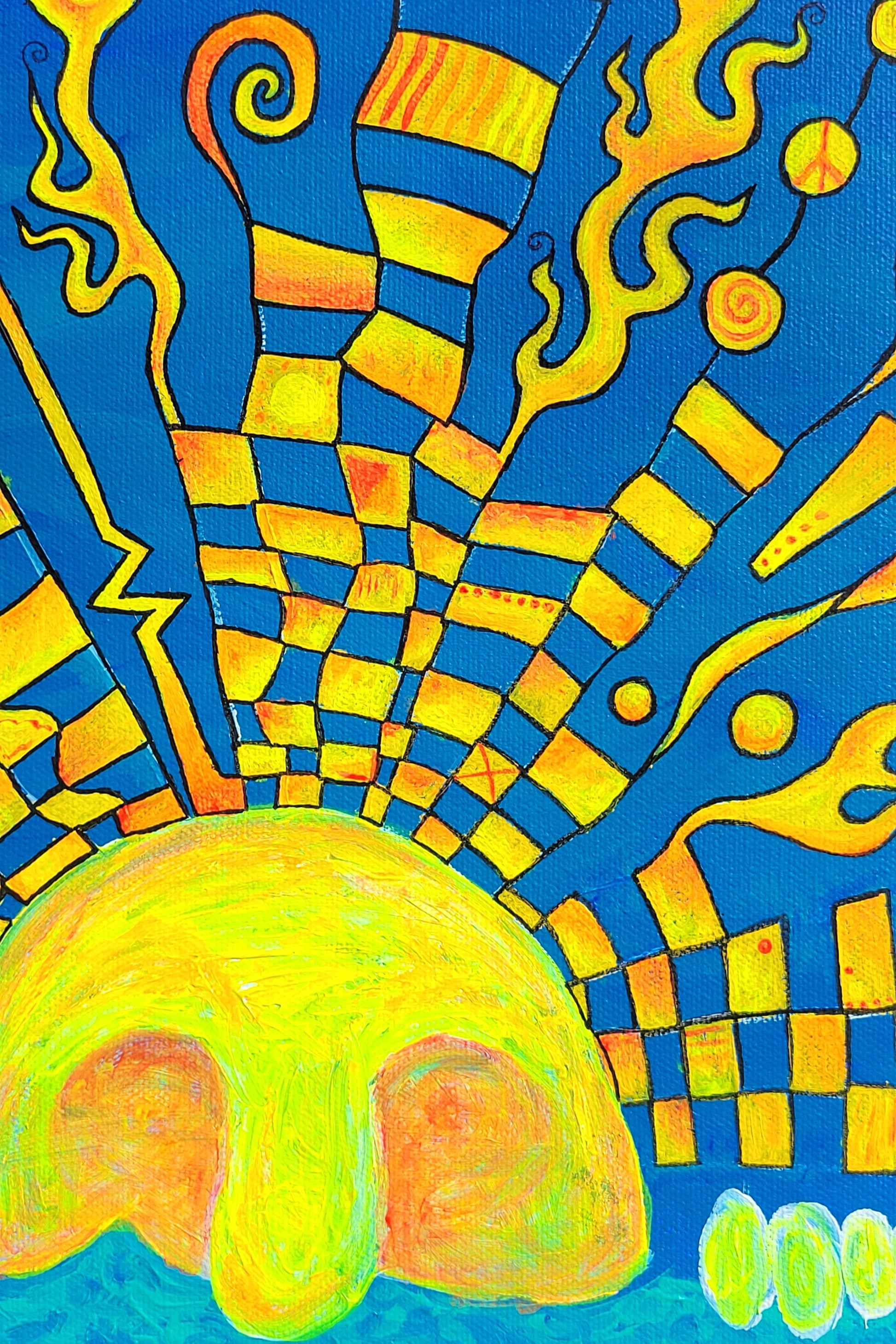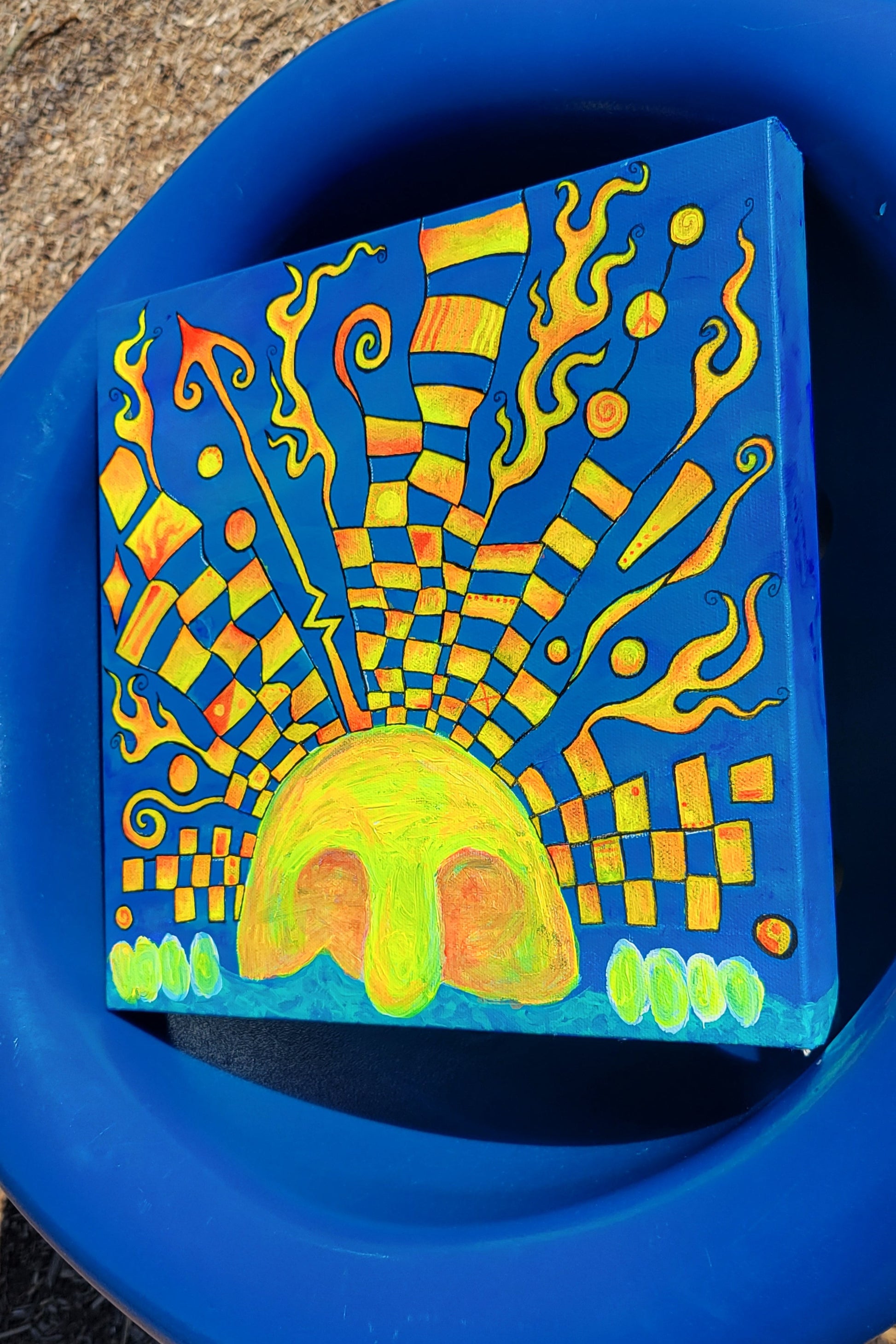 Bursting with energy and psychedelic flair, “Make Love Not War” is a 12"x12" original acrylic painting that radiates bold color and surreal imagination. A glowing yellow form—part mushroom, part sunrise—anchors the center, sending vibrant checkerboard rays and electric tendrils across a rich blue sky. Flames, spirals, and symbols dance outward in bright oranges, yellows, and pinks, creating a hypnotic rhythm that feels alive.